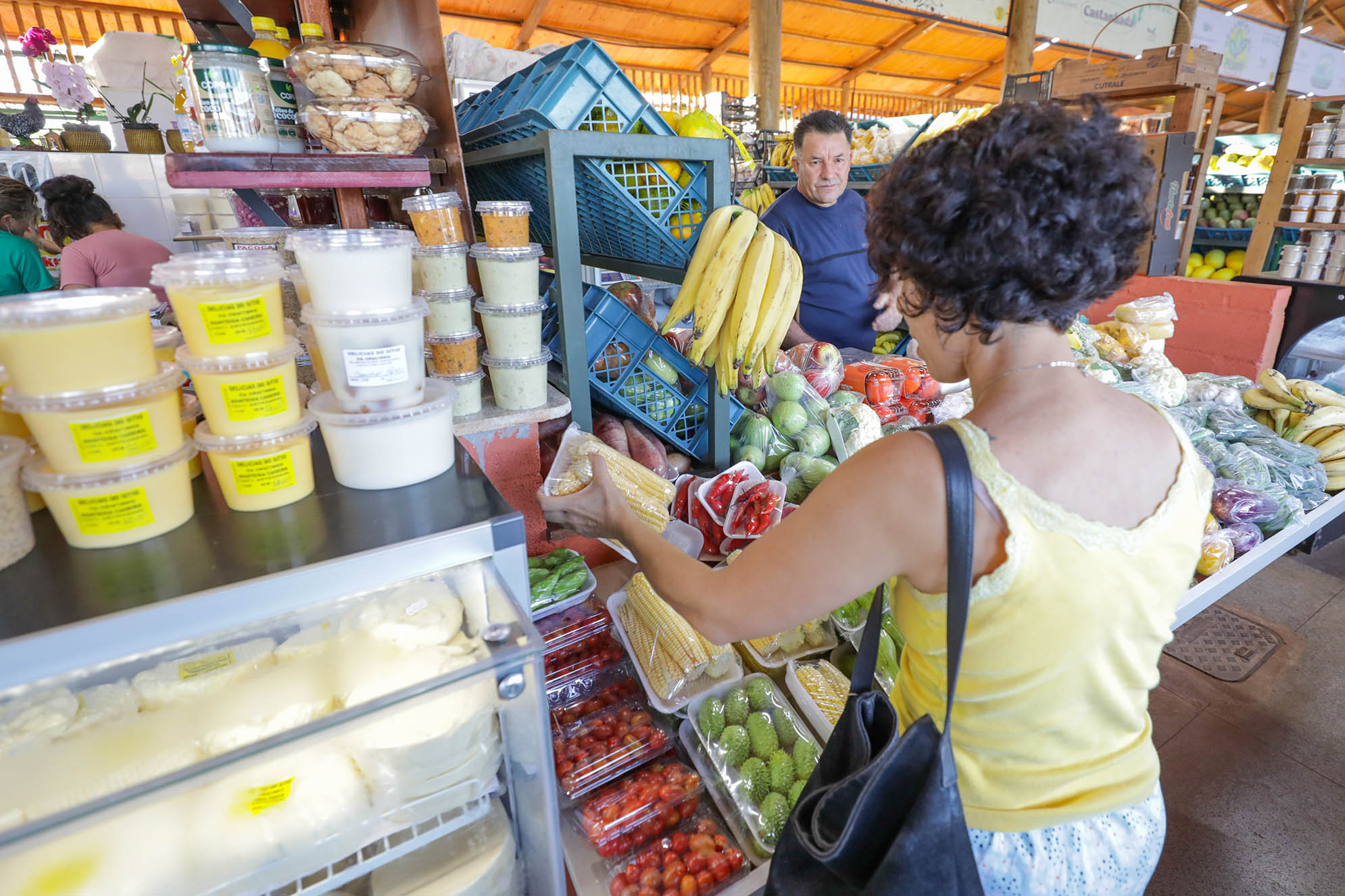 A variedade de mercadorias disponíveis no empório é extensa: há laticínios, como queijos e doces de leite, hortaliças, embutidos, entre linguiças e salames, pães, artesanato, e mais. À frente de uma banca de hortaliças e temperos rurais, a produtora rural Ismênia Aparecida de Oliveira, 79, afirma que o movimento aumentou graças à nova localização. “A estrutura melhorou muito e a nossa clientela está voltando. Adoro fazer temperos e tenho alguns carros-chefes. As pessoas já sabem onde me encontrar”, comenta.