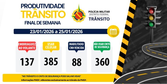 Entre os dias 23 e 25 de janeiro, a Polícia Militar do Distrito Federal (PMDF) intensificou as ações de fiscalização em diversas regiões, com foco na proteção da vida, na prevenção de acidentes, na redução de comportamentos de risco nas vias e na promoção de maior fluidez do trânsito. As equipes registraram 137 autuações por embriaguez ao volante, 385 por uso de celular ao dirigir, 88 por condução sem habilitação ou com CNH vencida e 360 por não utilização do cinto de segurança.
